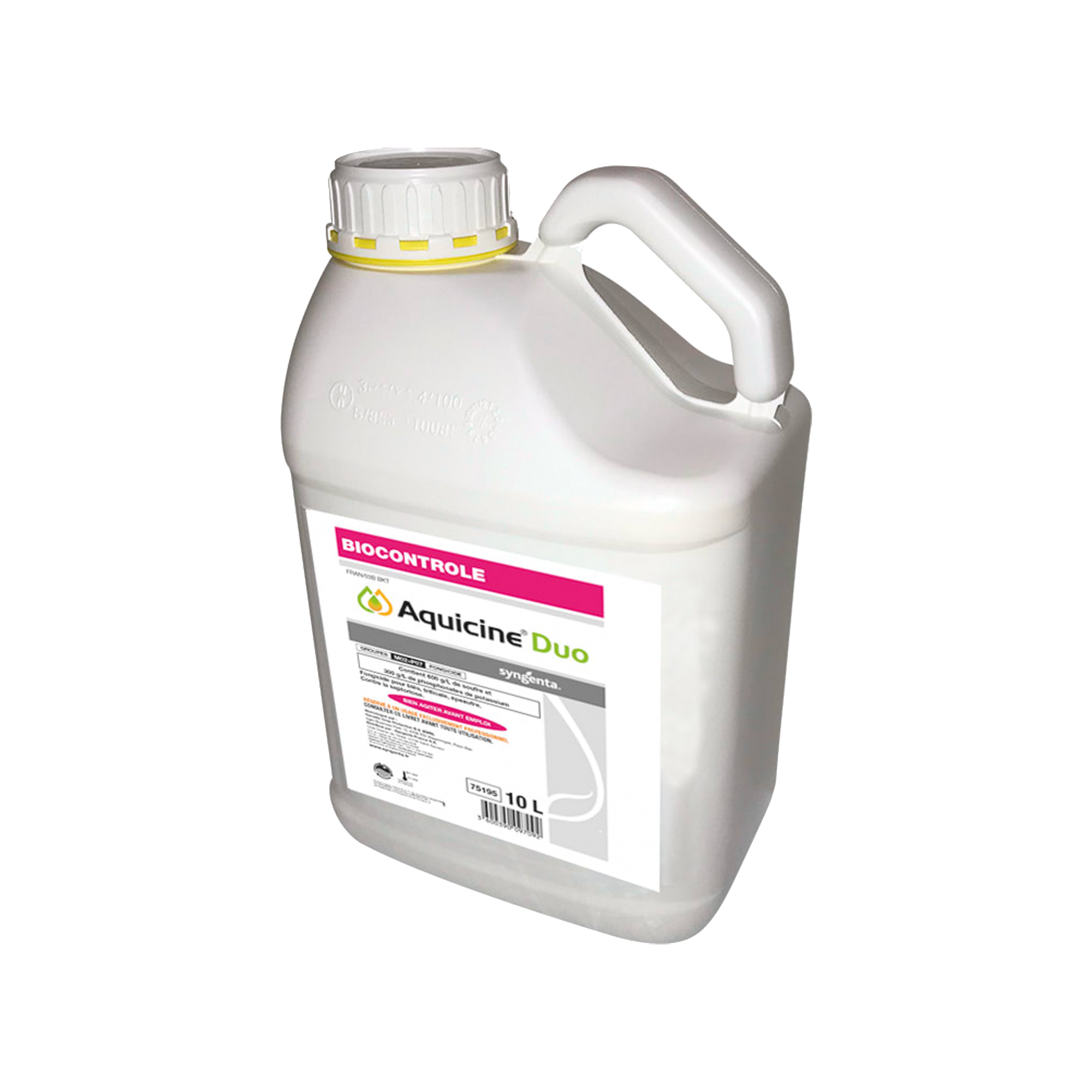 AQUICINE® DUO - AMM N° 2230160 - Composition : 600 g/l soufre + 300 g/l Phosphonates de potassium - P264 Se laver les mains soigneusement après manipulation. P280 Porter des gants de protection/des vêtements de protection (se reporter au livret de l'étiquette pour le détail des protections aux différentes phases). P302+P352 EN CAS DE CONTACT AVEC LA PEAU : laver abondamment à l'eau. P332+P313 En cas d'irritation cutanée : consulter un médecin. P362+P364 Enlever les vêtements contaminés et les laver avant réutilisation. P501 Éliminer le contenu/récipient dans une installation d'élimitation des déchets agréée. Respecter une distance d'au moins 3 mètres entre la rampe de pulvérisation et l'espace fréquenté par les personnes présentes lors du traitement et/ou l'espace susceptible d'être fréquenté par des résidents. SP1 Ne pas polluer l'eau avec le produit ou son emballage. Ne pas nettoyer le matériel d'application près des eaux de surface. Éviter la contamination via les systèmes d'évacuation des eaux à partir des cours de ferme ou des routes. SPe3 Pour protéger les organismes aquatiques, respecter une zone non traitée de 5 mètres comportant un dispositif végétalisé permanent non traité d'une largeur de 5 mètres en bordure des points d'eau. SPe8 Pour protéger les abeilles et autres insectes pollinisateurs, ne pas utiliser en présence d'abeilles et autres insectes pollinisateurs.